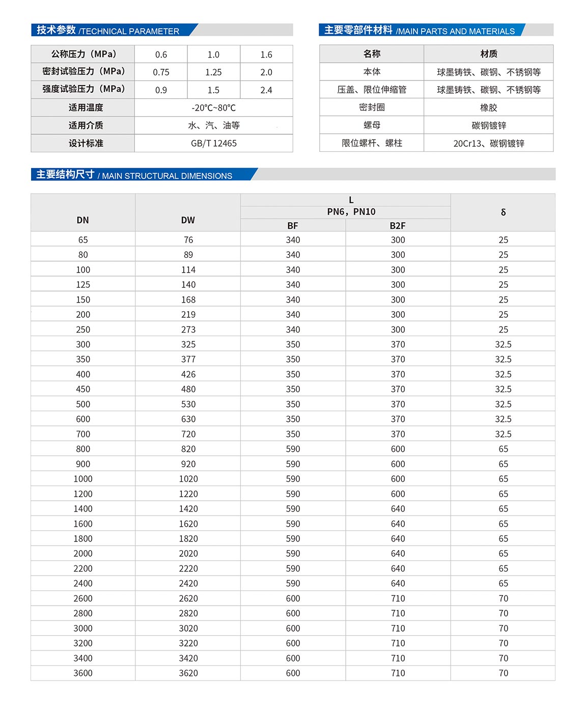 松套限位補(bǔ)償接頭可廣泛與蝶閥、閘閥、止回閥、截止閥等閥門及管道配套使用,可降低工程費用能有效解決閥門裝卸困難。主要用于管道與閥門連接,可防止管道在外部作用力及熱脹冷縮引起的內(nèi)部作用力較大時,拉脫伸縮接頭,造成不必要的管道泄漏事故。